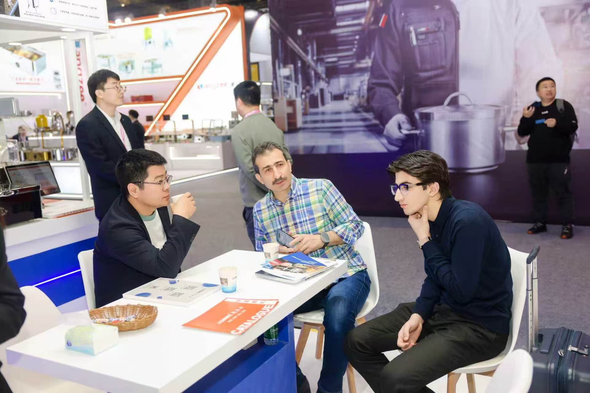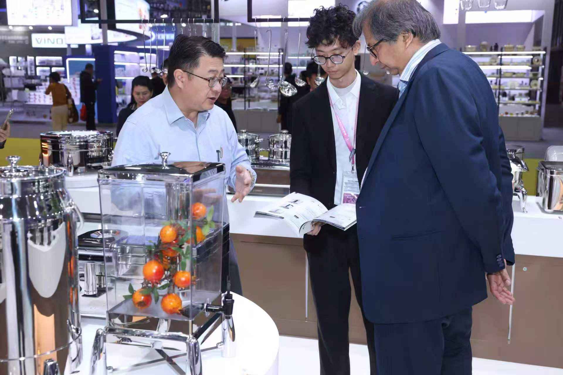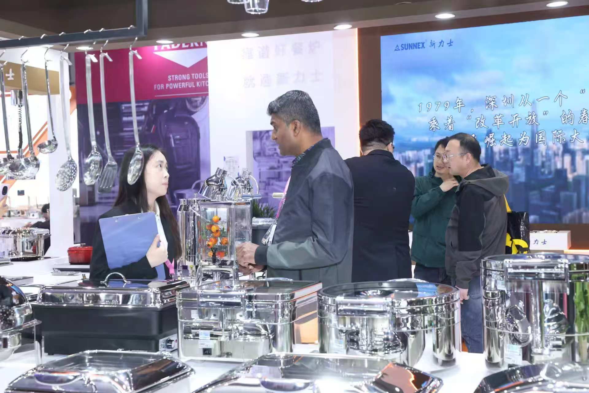 প্রদর্শনী চলাকালীন, ব্র্যান্ডটি জলবিহীন শুষ্ক চাফিং ডিশ, ক্লাসিক স্টেইনলেস স্টিল গ্যাস্ট্রোনর্ম প্যান, ভেরোনা সিরিজের দুধের কলস, আইস-টিউব বেভারেজ ডিসপেনসার এবং অন্যান্য নতুন পণ্য সহ বেস্টসেলার প্রদর্শনের উপর দৃষ্টি নিবদ্ধ করে, উচ্চমানের হোটেল, চেইন ক্যাটারিং ব্র্যান্ড এবং স্টাফ ক্যান্টিনের বিভিন্ন চাহিদা পূরণ করে। আমাদের বুথ মধ্যপ্রাচ্য, আফ্রিকা, ইউরোপ, আমেরিকা এবং দক্ষিণ-পূর্ব এশিয়া জুড়ে পেশাদার বিদেশী ক্রেতাদের কাছ থেকে ক্রমাগত পরিদর্শন পেয়েছে। আমাদের পেশাদার দল গভীর সহযোগিতা আলোচনার জন্য একের পর এক পণ্য পরিচিতি এবং কাস্টমাইজড সমাধান সমর্থন প্রদান করেছে।